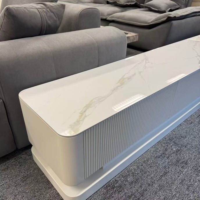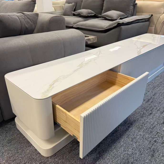 Elevate your living space with this exquisite pure white stone TV console, where minimalist modernity meets artisanal craftsmanship through its luminous sintered stone top and intricately carved solid wood base. The pristine white stone surface, resistant to scratches and stains, provides a flawless backdrop for your entertainment system while reflecting light to brighten the room, and the hand-carved openwork wooden substructure beneath introduces organic warmth and captivating shadow patterns that change throughout the day. This striking piece effortlessly bridges design styles - pair it with a neutral linen sofa and woven rug for Scandinavian serenity, contrast it with a bold-colored feature wall for contemporary drama, or complement it with metallic accents and glass decor for urban sophistication. The harmonious balance of the sleek stone and textured wood creates visual interest without overwhelming your space, making it equally suited for compact apartments seeking airy elegance and spacious homes needing a focal point. Whether displaying curated art objects or concealing media clutter in its discreet compartments, this console maintains a gallery-worthy presence while offering everyday functionality, its timeless material combination ensuring it remains stylish through evolving decor trends while the intricate carvings add unique character to your interior story.