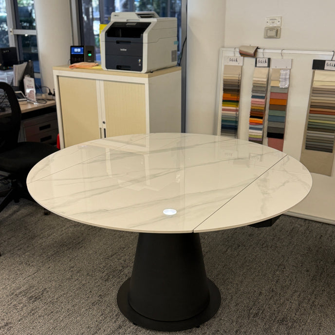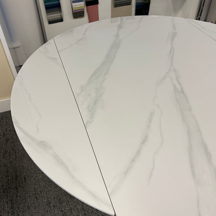 Upgrade your dining space with this modern extendable dining table, designed to balance elegance and performance. The glossy sintered stone tabletop offers the luxurious look of marble with superior resistance to heat, scratches, and stains—perfect for everyday use and entertaining. Its carbon steel base ensures stability and adds a contemporary edge, while the smooth extension mechanism allows you to easily adjust the table size to accommodate guests. Whether you're hosting a dinner party or enjoying a quiet meal, this table adapts to your lifestyle with effortless style.