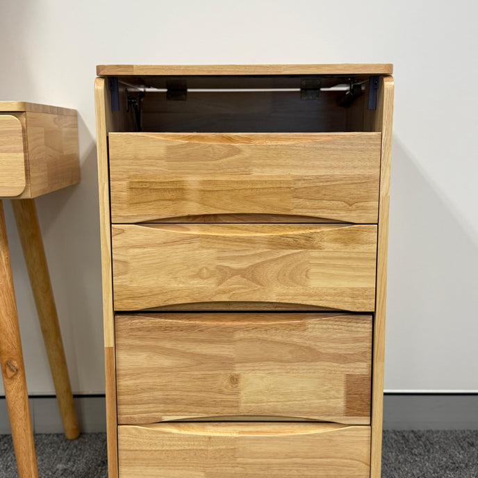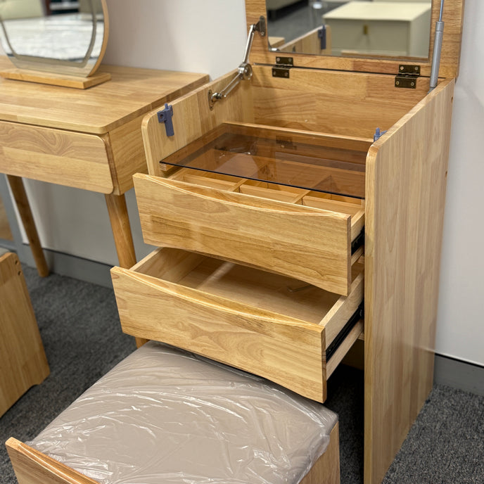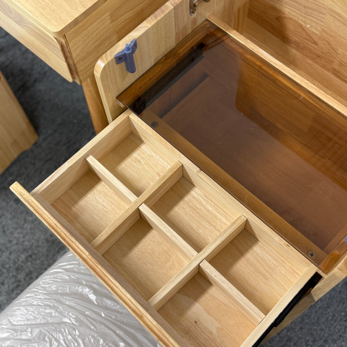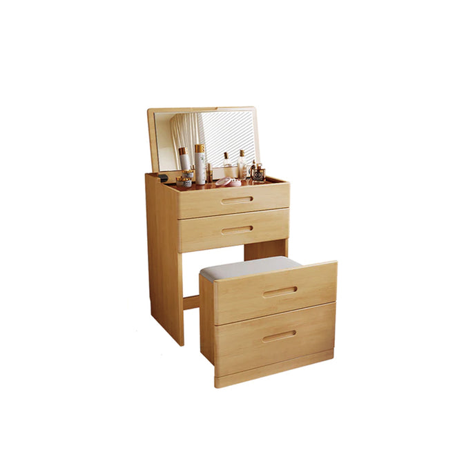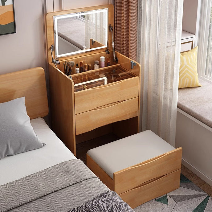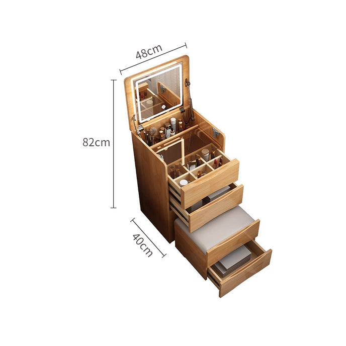This dressing cabinet features a minimalist design with hidden multifunctionality, making it practical and space-saving. The four storage drawers offer ample capacity for organizing valuable and private items. The flip-up high-definition makeup mirror is designed with a hidden mechanism that easily opens and closes; when not in use, it serves as a storage surface. The entire frame is crafted from solid wood, ensuring durability and environmental health with no unpleasant odors. Available in two color options (natural wood and walnut), it caters to various home styles. Rounded edges, silent hardware tracks, and inset groove handles enhance the user experience.