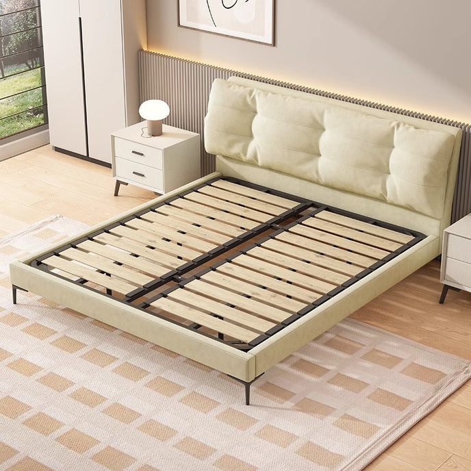The quality of furniture depends not only on craftsmanship but also primarily on the choice of materials. For this bed, we have chosen soft and comfortable cowhide for the surface, while the interior of the headboard uses down-filled soft padding, making it more comfortable to lean against. The solid wood frame and bed slats enhance the bed's stability and safety, and the PU leather upholstery of the bed body feels soft and comfortable. The carbon steel bed legs give the entire bed a more fashionable look.