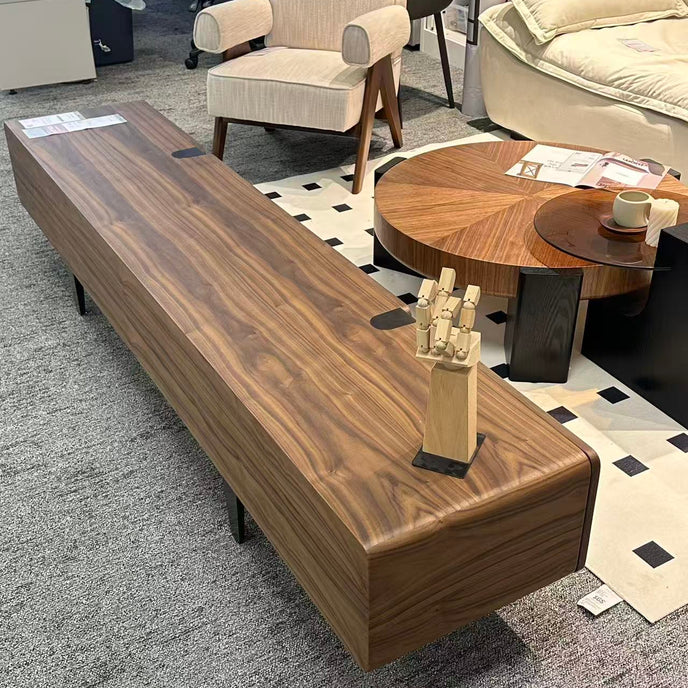 Elevate your living space with this sophisticated walnut grain TV console, where rich woodgrain textures meet industrial-chic brushed black titanium accents for a perfect balance of warmth and contemporary edge. The premium walnut veneer surface showcases natural woodgrain variations that add organic depth to your entertainment area, while the sleek titanium-finished legs and drawer pulls introduce a refined metallic contrast. Designed for modern lifestyles, this media cabinet effortlessly bridges rustic charm and urban sophistication - pair it with leather sofas and concrete walls for an industrial loft vibe, or combine with linen textiles and terrazzo side tables for Scandinavian-inspired harmony. The horizontal woodgrain pattern visually expands smaller spaces, and the titanium's subtle sheen catches light beautifully throughout the day. Whether anchoring your home theater setup or displaying curated decor in a minimalist living room, this piece transitions seamlessly between cozy family nights and stylish entertaining. The thoughtful material combination of warm walnut and cool titanium creates a timeless foundation that complements evolving decor styles, from seasonal accent colors to permanent furniture investments, making it as versatile as it is visually striking.