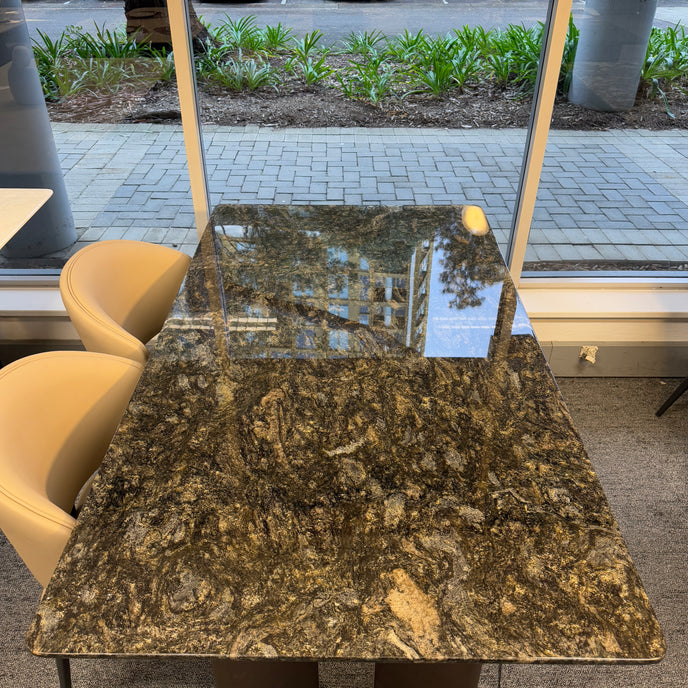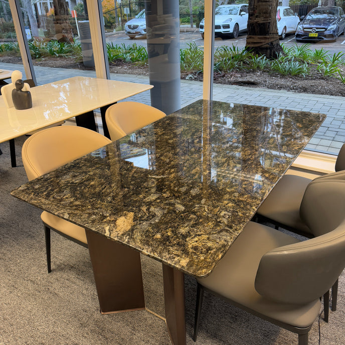 Italian-style luxury stone dining table with a natural platinum diamond stone tabletop. The stone features natural, smooth textures with a bright luster and a warm touch. Paired with carbon steel legs for durability and strong load-bearing capacity. The table has a modern and minimalist design with smooth lines, making it suitable for various home styles. The tabletop is constructed with a multi-layered structure, including a crack-resistant coating and a natural resin finish to prevent deformation and cracking, ensuring a long service life. Available in multiple sizes to meet different space requirements.