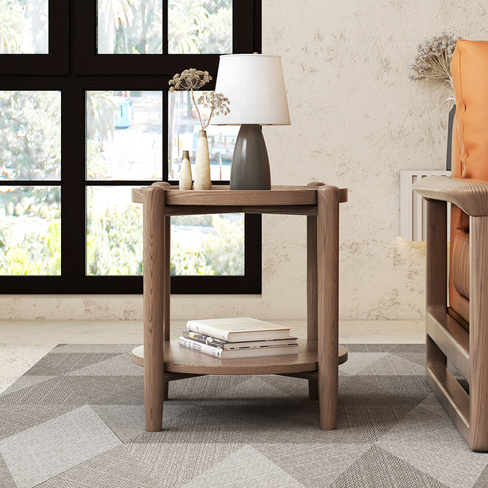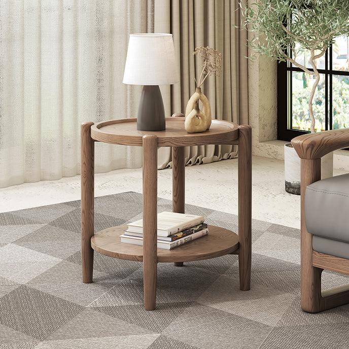 Walnut-Toned Ash Wood Two-Tier Round Side Table