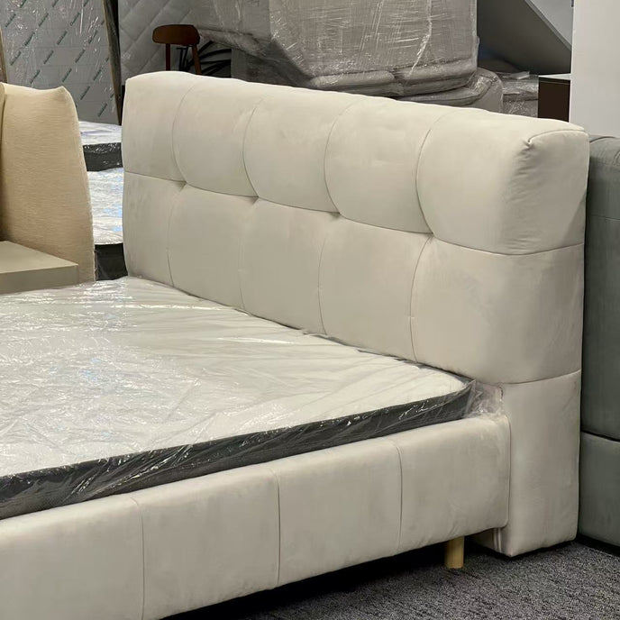 The quality of furniture depends not only on craftsmanship but also primarily on the choice of materials. For this bed, we have chosen soft and comfortable brushed fabric for the surface, and the headboard features plush cotton cushions, making it more comfortable to lean against. The solid wood frame and bed legs enhance the bed's stability and safety. The pine wood slats provide excellent load-bearing performance.