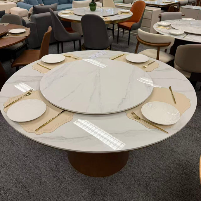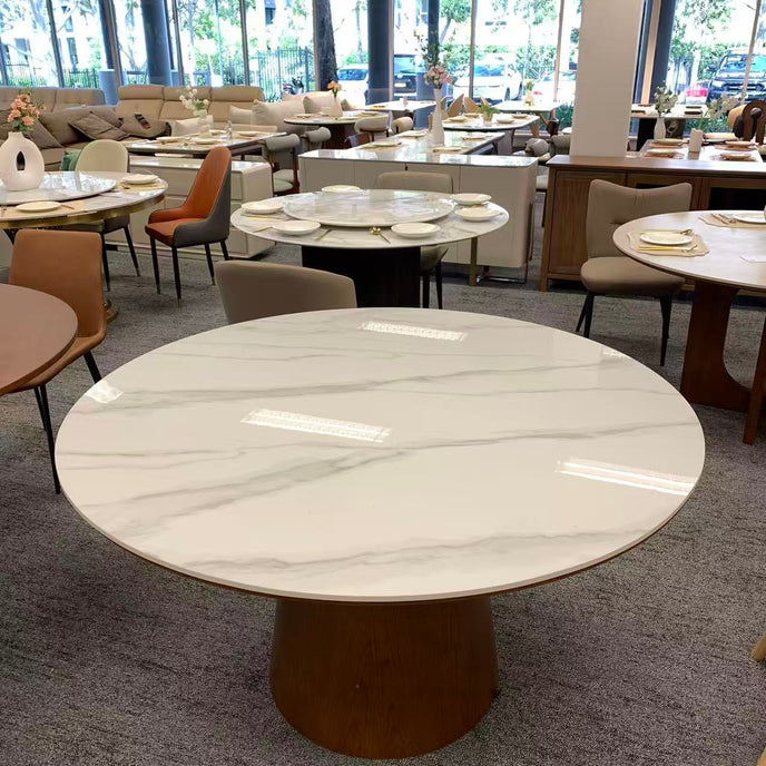 Crafted with a premium white rock surface and solid walnut-stained legs, this round dining table seamlessly blends durability with elegance. The rock top is highly resistant to heat, scratches, and stains, ensuring easy maintenance and long-lasting use, while the built-in lazy Susan (rotating tray) enhances convenience for shared meals and entertaining. The warm walnut tone of the legs contrasts beautifully with the crisp white tabletop, creating a balanced and sophisticated aesthetic.