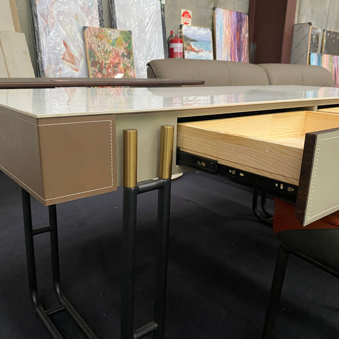 The quality of a piece of furniture not only depends on the manufacturing process, but also on the material selection. Our set of desks and chairs uses rock panels as the countertop, which have many advantages such as high temperature resistance, scratch resistance, and corrosion resistance. The multi-layer solid wood board serves as a support to increase the stability and safety of the desk, and the surface is made of saddle leather, with a smooth texture that makes people look forward to every touch. The drawer is made of solid wood material, which is more sturdy and durable. The stainless steel table legs make the entire desk look more fashionable. Paired with a 360 ° rotatable office chair, we use soft and comfortable microfiber leather as the fabric, filled with high-density sponge inside for a comfortable sitting experience and good rebound performance. The carbon steel chair legs make the overall look more fashionable.