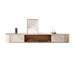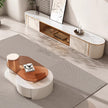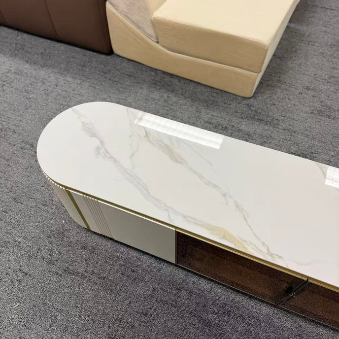 This glacier white rock panel TV console blends alpine-inspired purity with functional elegance, featuring a durable stone-laminate top over a solid wood carcass with integrated glass-front cabinets." The luminous white surface, etched with subtle gray veining reminiscent of ice fractures, reflects light to brighten your entertainment area, while the tempered glass doors provide discreet storage visibility. The natural wood framework introduces warmth to balance the cool stone tones, creating a transitional piece that complements both modern marble-floored spaces and rustic exposed-beam interiors.