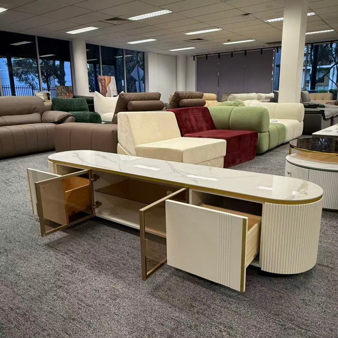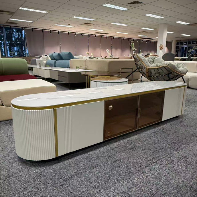 Pre Sale Glacier White Rock Panel TV Console with Solid Wood & Glass Doors
