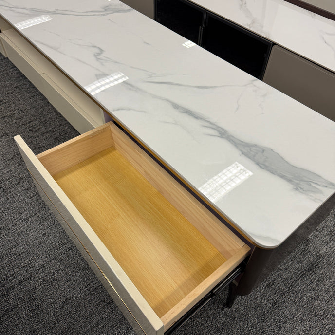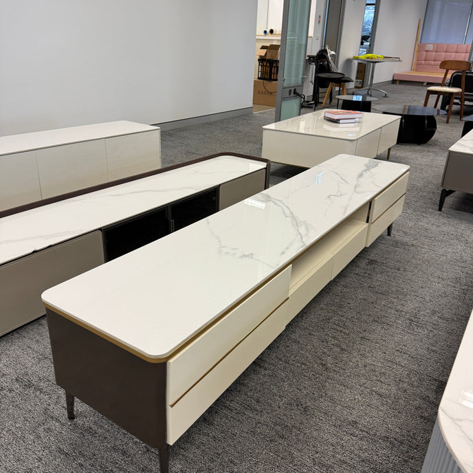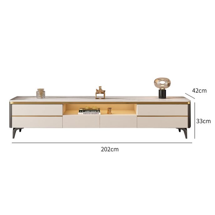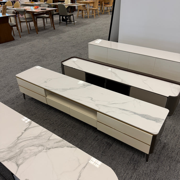 The quality of a piece of furniture is not only determined by the manufacturing process, but also by the material selection. Our TV cabinet uses rock panels as the countertop, which have many advantages such as high temperature resistance, scratch resistance, and corrosion resistance. The use of density board material in the frame makes the product more stylish and durable. The drawer is made of solid wood material, which is more sturdy and durable. The stainless steel cabinet legs make the entire TV cabinet look more fashionable.
